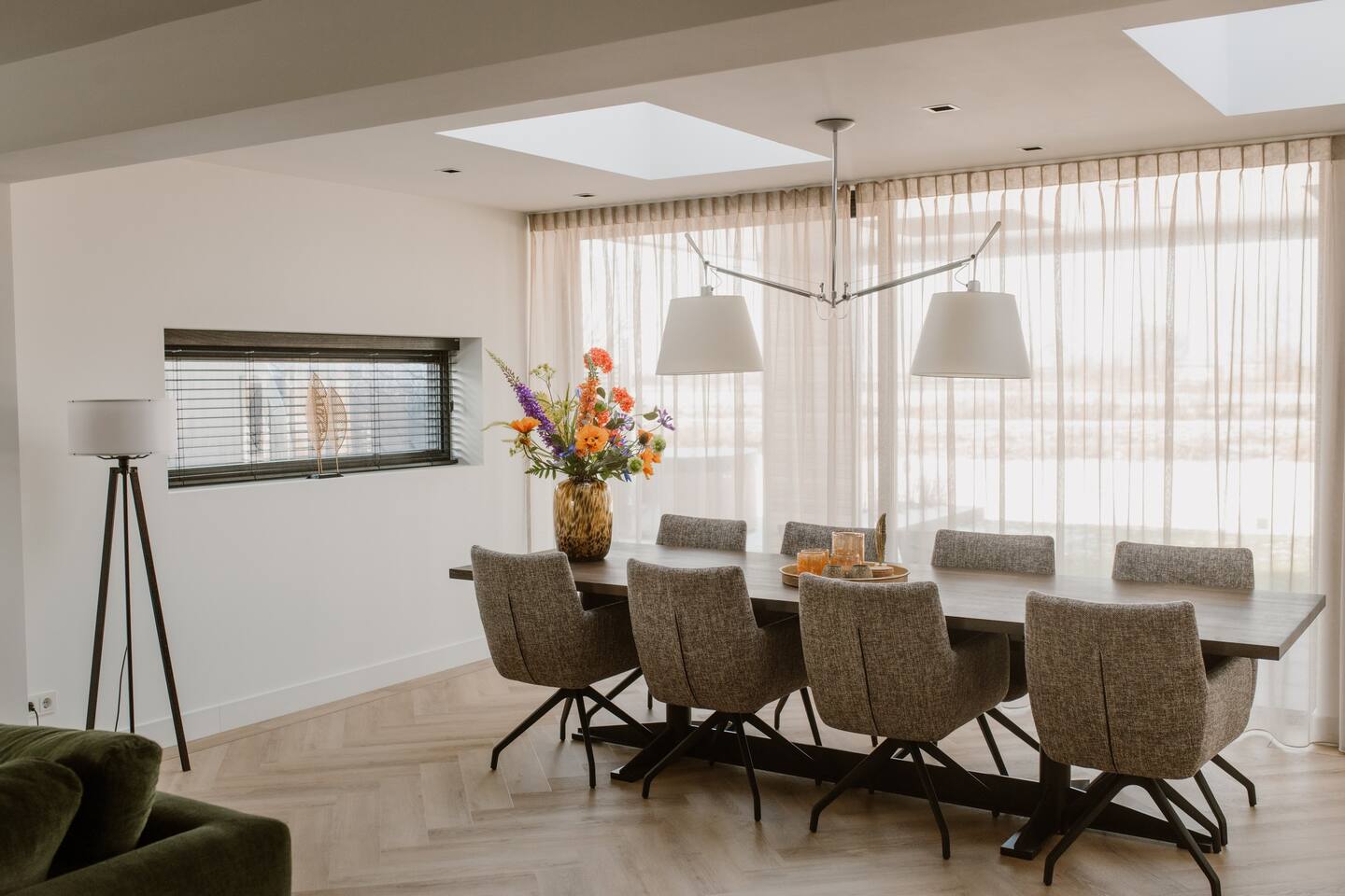 Watervilla Terherne beschikt over 2 woonkamers met heerlijke hangbanken en 2 tv’s. Aansluitend bevindt zich de keuken met bar en inbouwapparatuur. Daarnaast is er een grote eettafel voor 8 personen. Verder zijn er 4 slaapkamers op de 1e en 2e verdieping. Bovendien beschikt de woning over een aanlegsteiger van 20 meter.